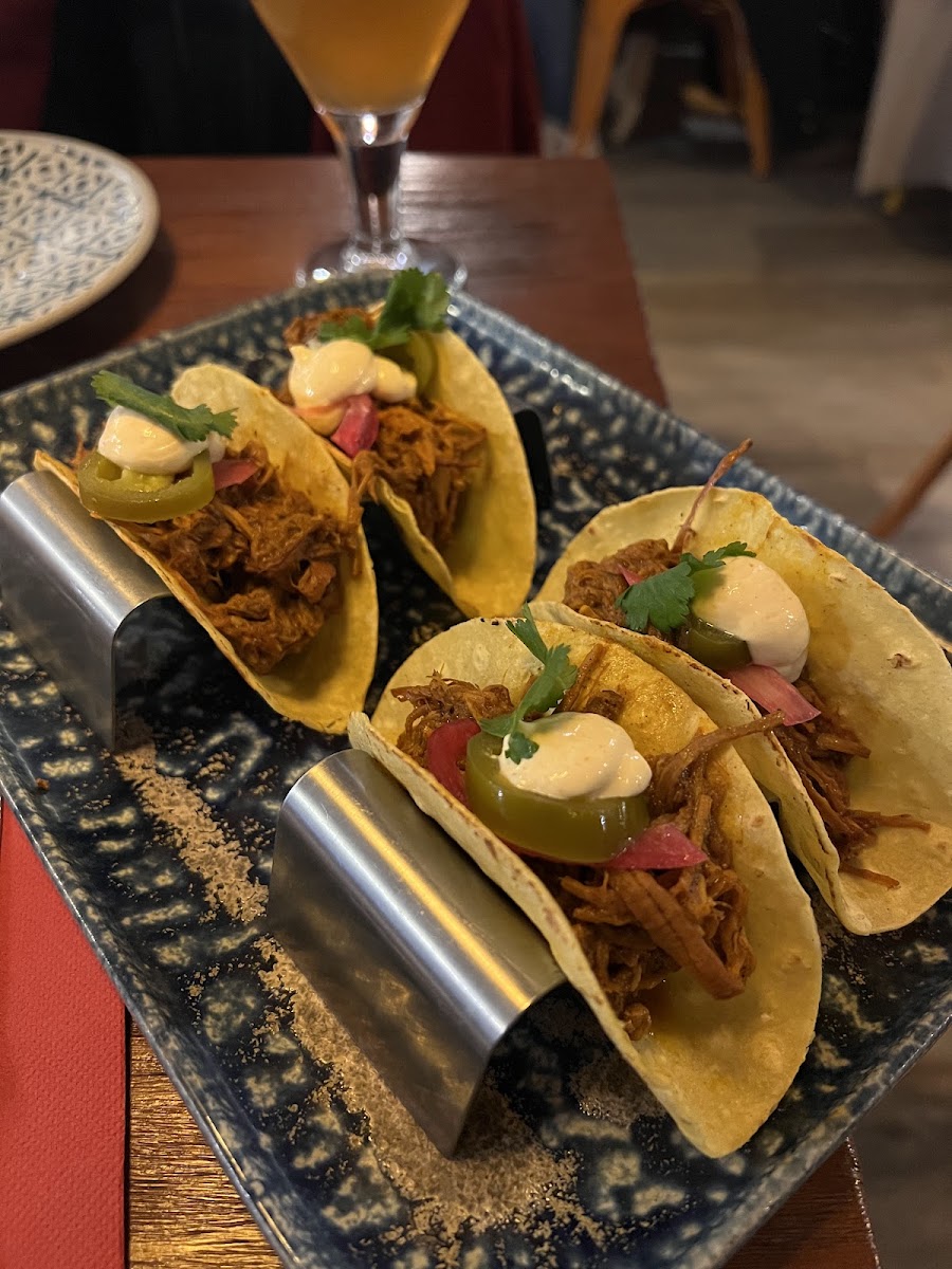 Perfect meal for our last evening in Barcelona. Suggested by a long time local, the very friendly (English speaking) staff provided excellence accommodations and service. The recommended dishes were delicious - Papa Bravas served with sauces on the side, Prawns in garlic and oil, Conchitas Pipil tacos, Eggs and Ham on fries and House chicken fingers - served with olives and a very tasty Catalan Vermouth! (took photo late because so yummy first bites devoured the tacos, three "street tacos":) Other meals looked equally tasty. Family of four well fed for very reasonable price. We highly recommend eating here, thank you Manteca!
